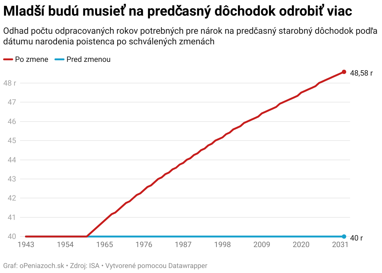 Odhad počtu odpracovaných rokov potrebných pre nárok na predčasný starobný dôchodok podľa dátumu narodenia poistenca po schválených zmenách