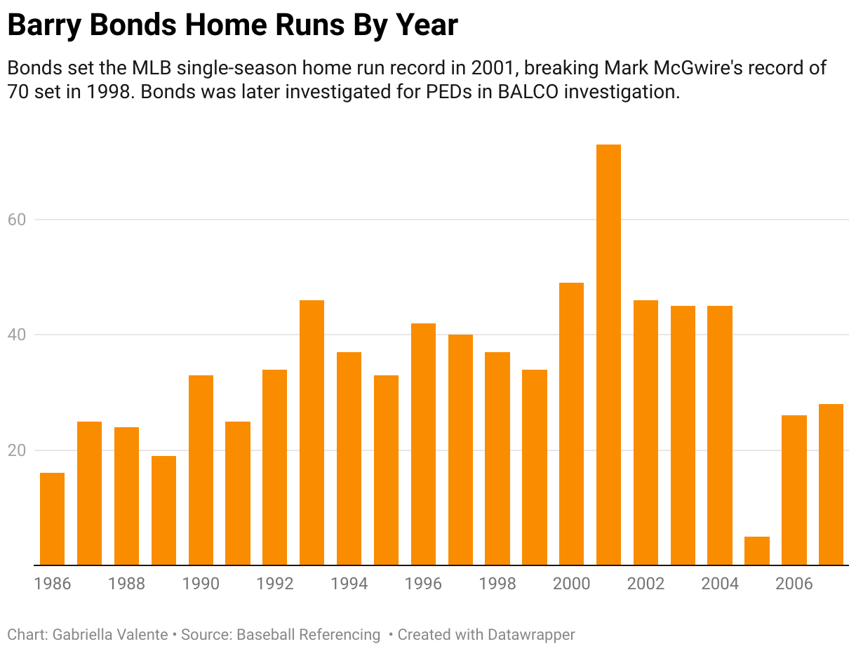 Chart data -- Barry Bonds Home Runs By Year- Bonds set the MLB single-season home run record in 2001, breaking Mark McGwire's record of 70 set in 1998. Bonds was later investigated for PEDs in BALCO investigation.