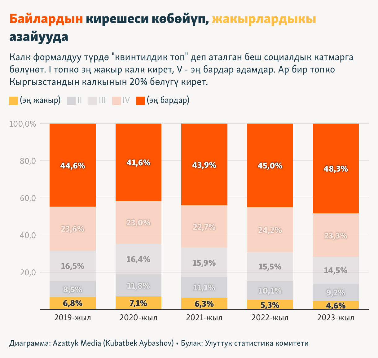 Калк формалдуу түрдө "квинтилдик топ" деп аталган беш социалдык катмарга бөлүнөт. I топко эң жакыр калк кирет, V - эң бардар адамдар. Ар бир топко Кыргызстандын калкынын 20% бөлүгү кирет.