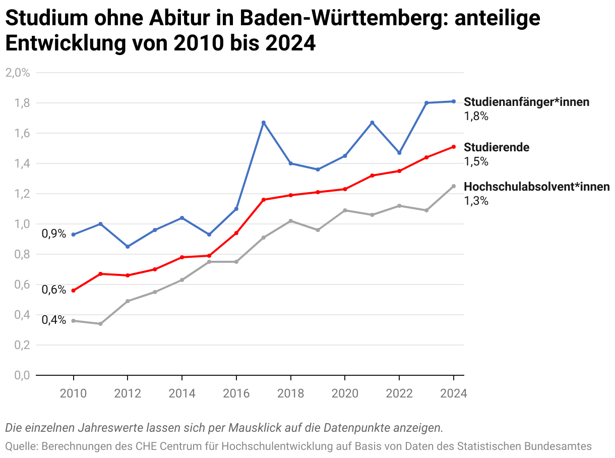 Studium ohne Abitur in Baden-Württemberg: anteilige Entwicklung von 2010 bis 2024