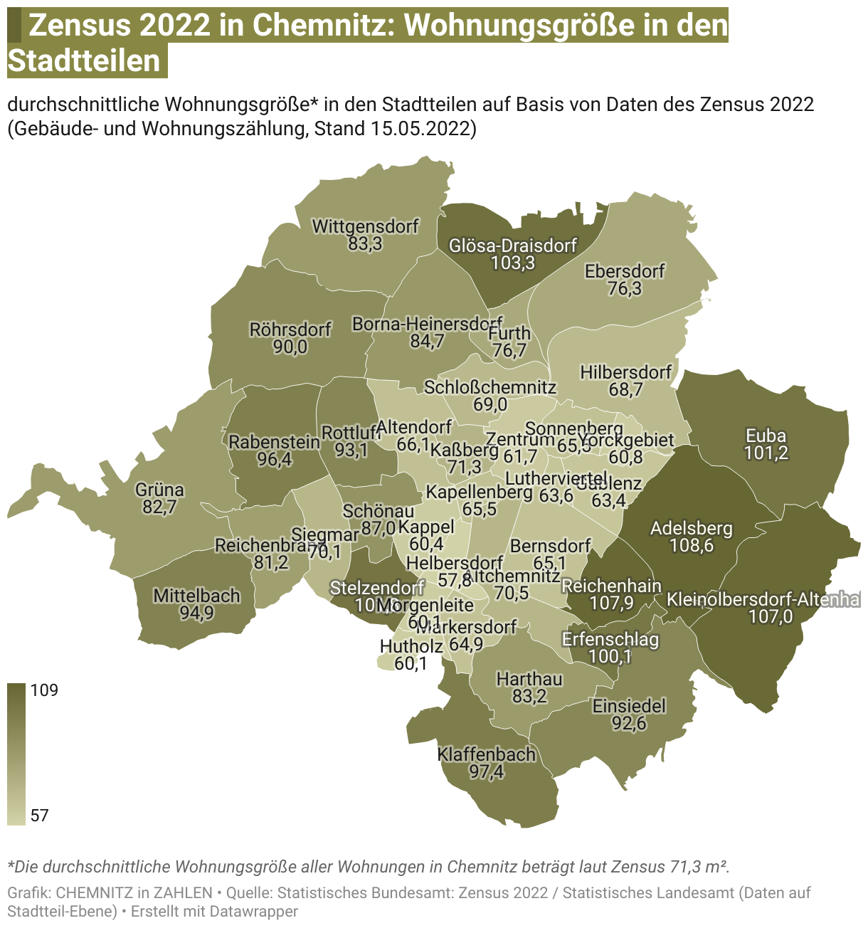 durchschnittliche Wohnungsgröße* in den Stadtteilen auf Basis von Daten des Zensus 2022 (Gebäude- und Wohnungszählung, Stand 15.05.2022)