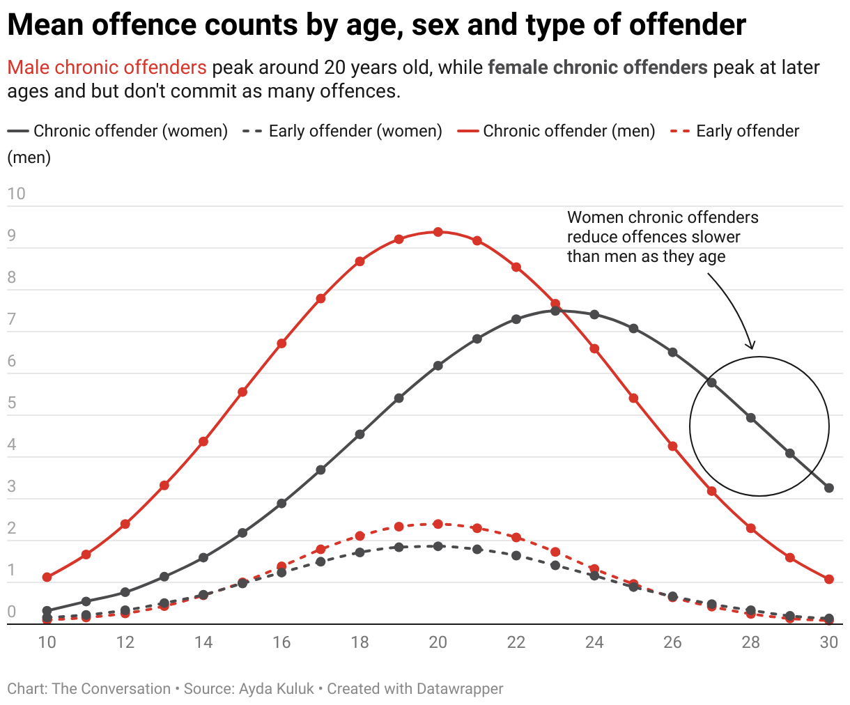 Male chronic offenders peak around 20 years old, while female chronic offenders peak at later ages and but don't commit as many offences.
