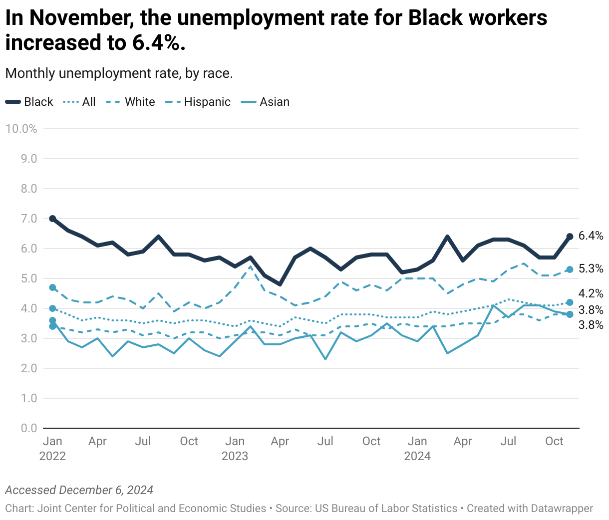 Monthly unemployment rate, by race.
