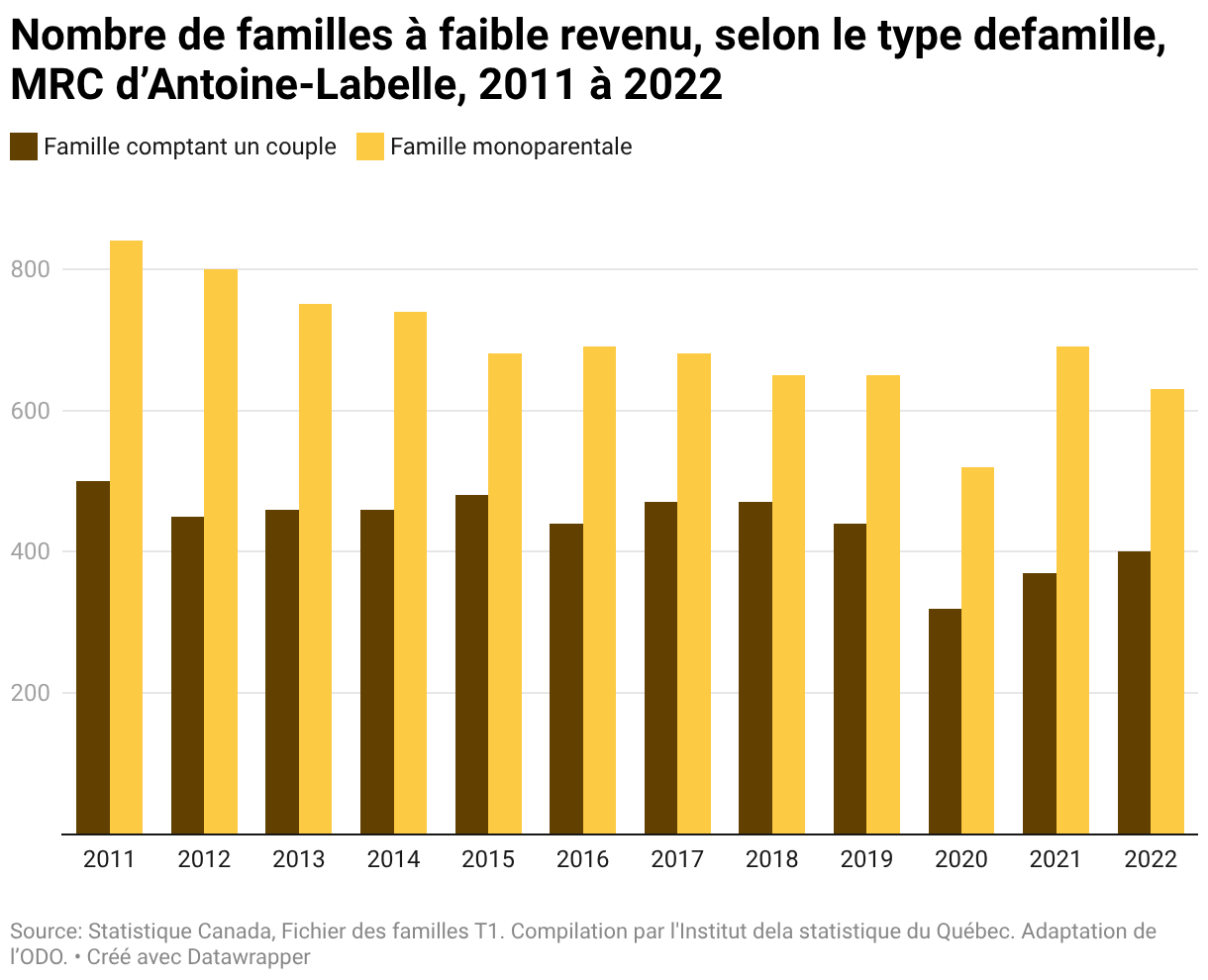 Nombre de familles à faible revenu, selon le type defamille, MRC d’Antoine-Labelle, 2011 à 2022