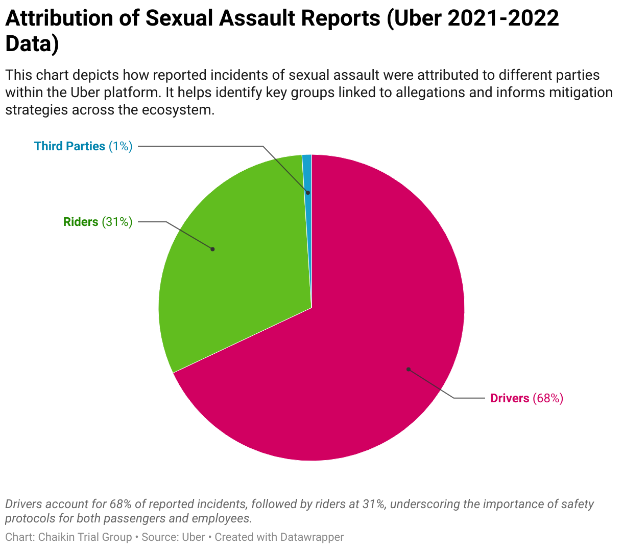 This chart depicts how reported incidents of sexual assault were attributed to different parties within the Uber platform. It helps identify key groups linked to allegations and informs mitigation strategies across the ecosystem.
