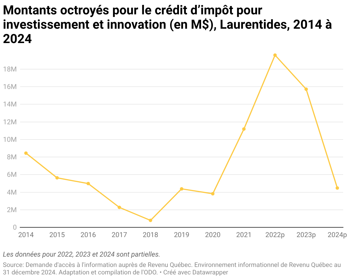 Montants octroyés pour le crédit d’impôt pour investissement et innovation (en M$), Laurentides, 2014 à 2024