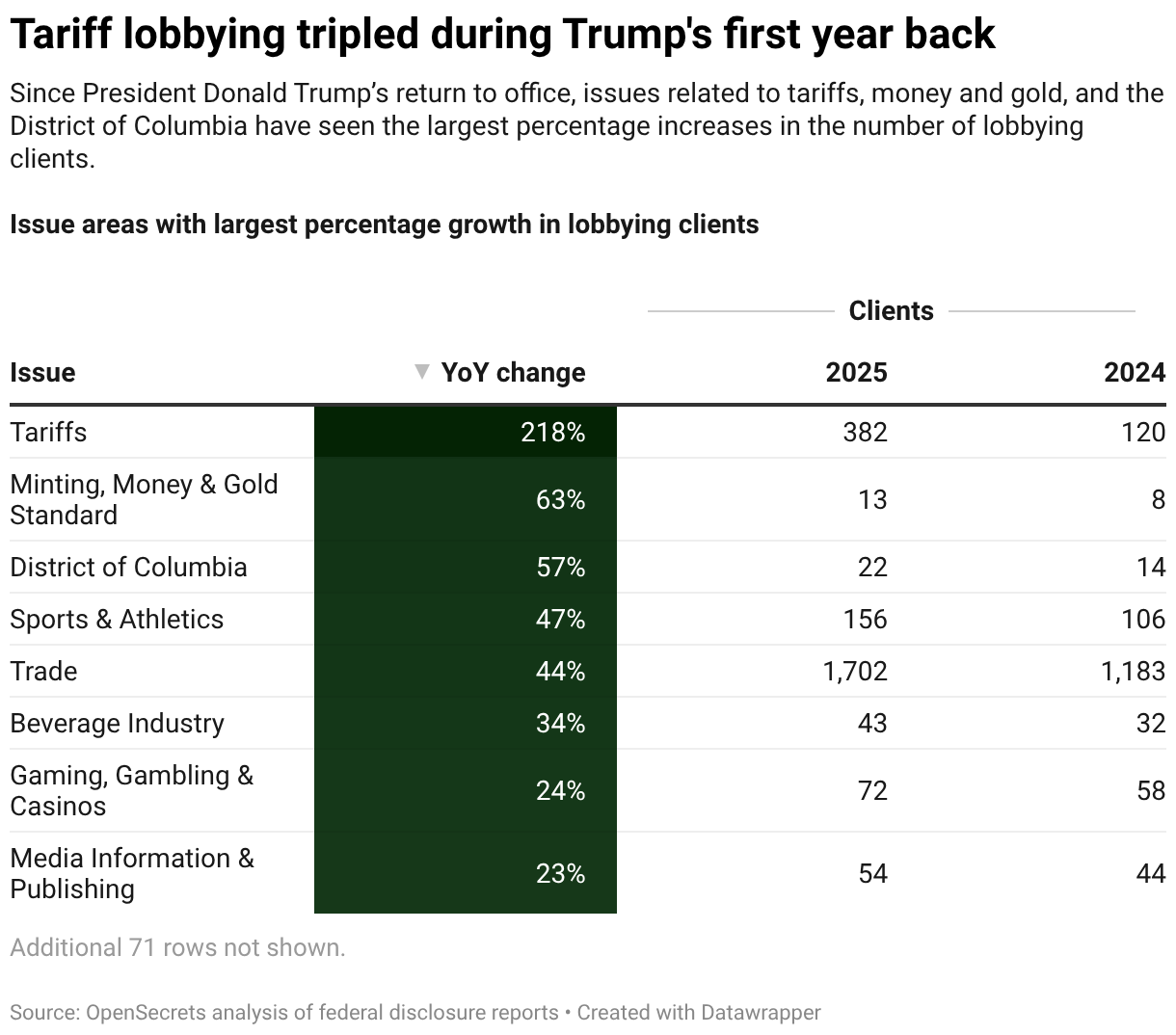 Since President Donald Trump’s return to office, issues related to tariffs, money and gold, and the District of Columbia have seen the largest percentage increases in the number of lobbying clients.