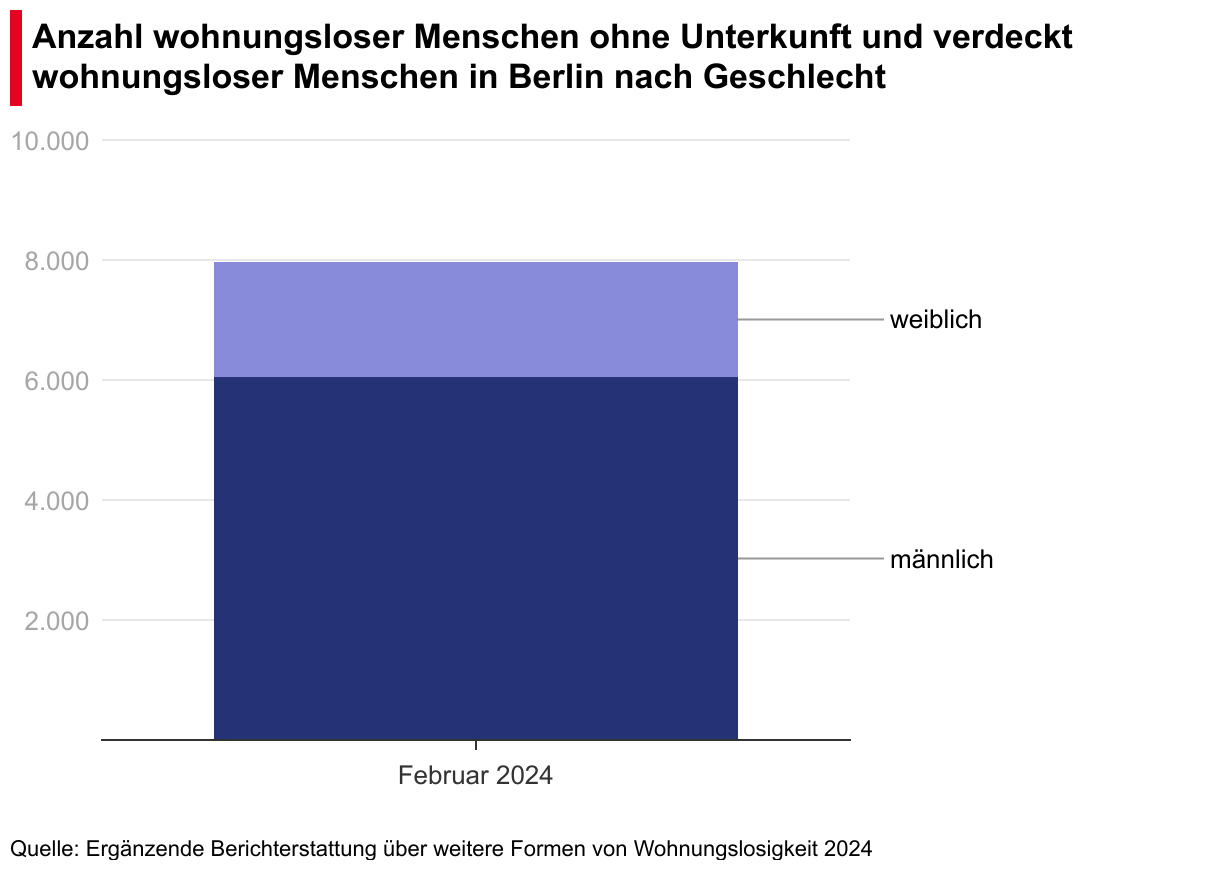 Anzahl wohnungsloser Menschen ohne Unterkunft und verdeckt wohnungsloser Menschen in Berlin nach Geschlecht