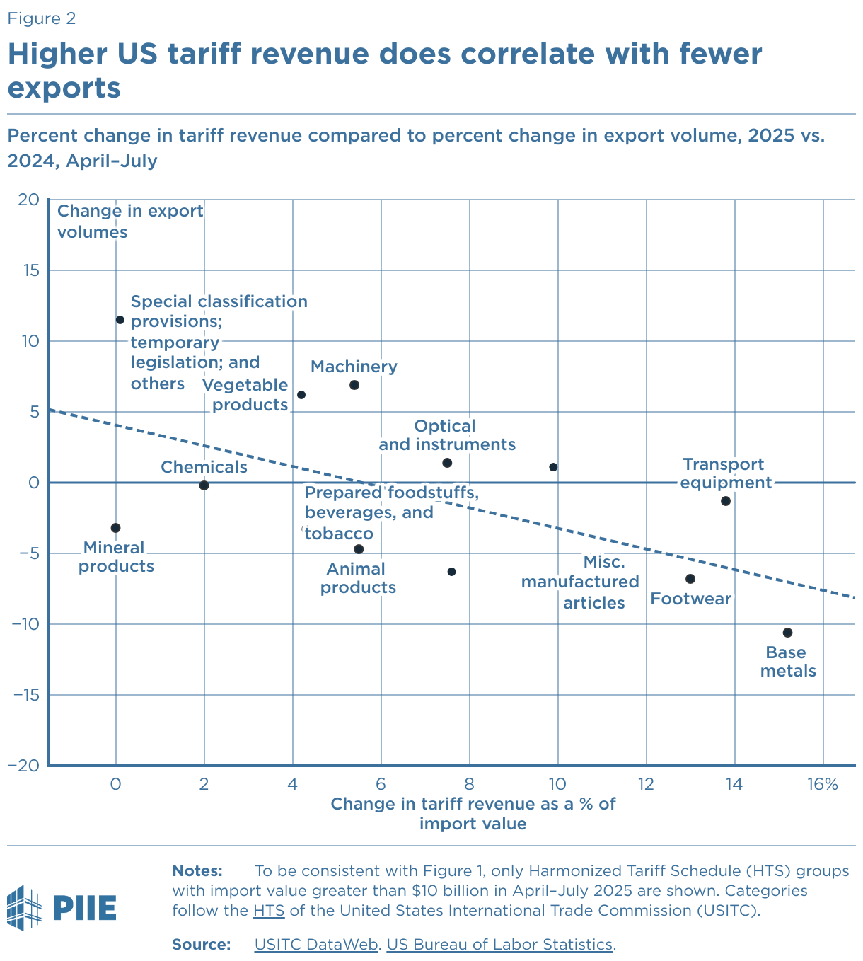 Percent change in tariff revenue compared to percent change in export volume, 2025 vs. 2024, April–July
