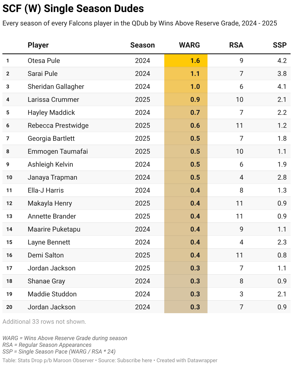 Every season of every Falcons player in the QDub by Wins Above Reserve Grade, 2024 - 2025