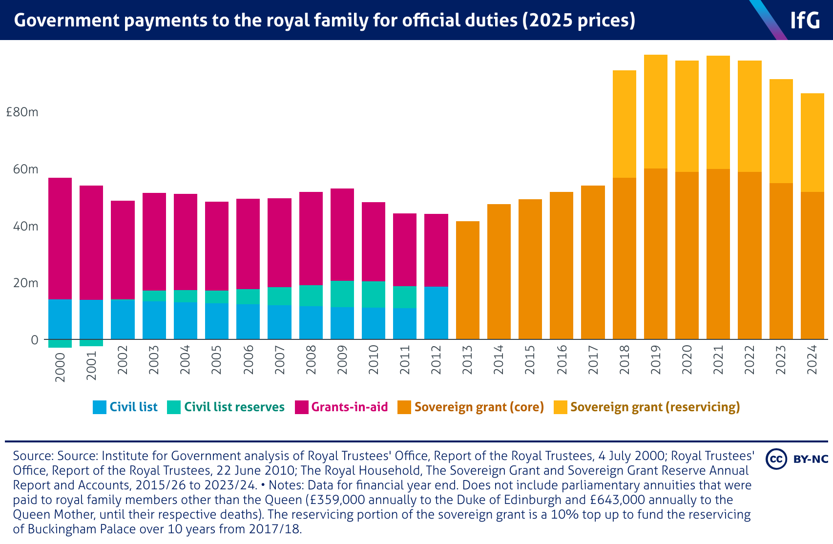 Stacked bar chart outlining how the government payments to the royal family have changed from 1992 to 2024. From 2017 the additional money for reservicing Buckingham Palace has increased the government payments.