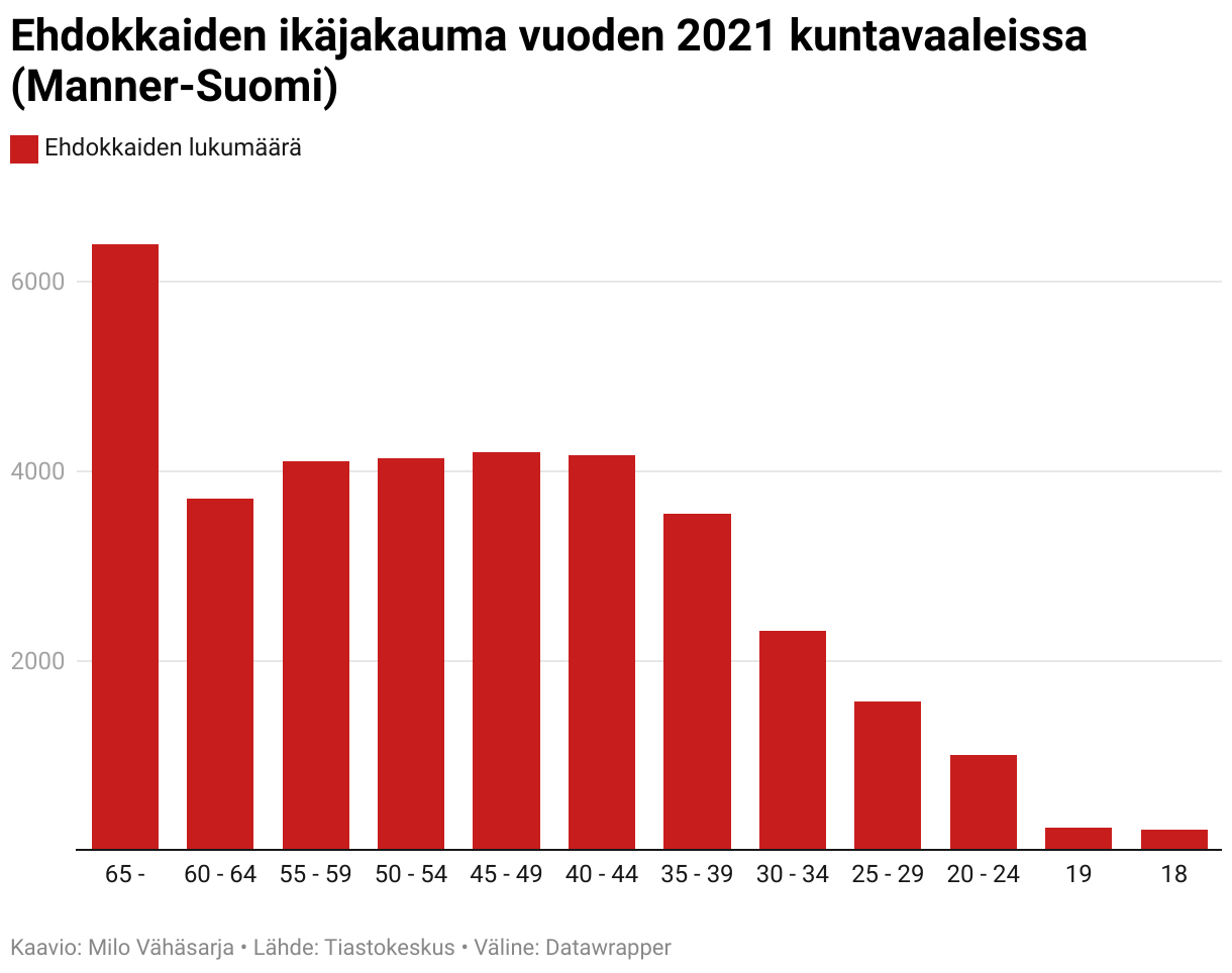Ehdokkaiden ikäjakauma vuoden 2021 kuntavaaleissa (Manner-Suomi)