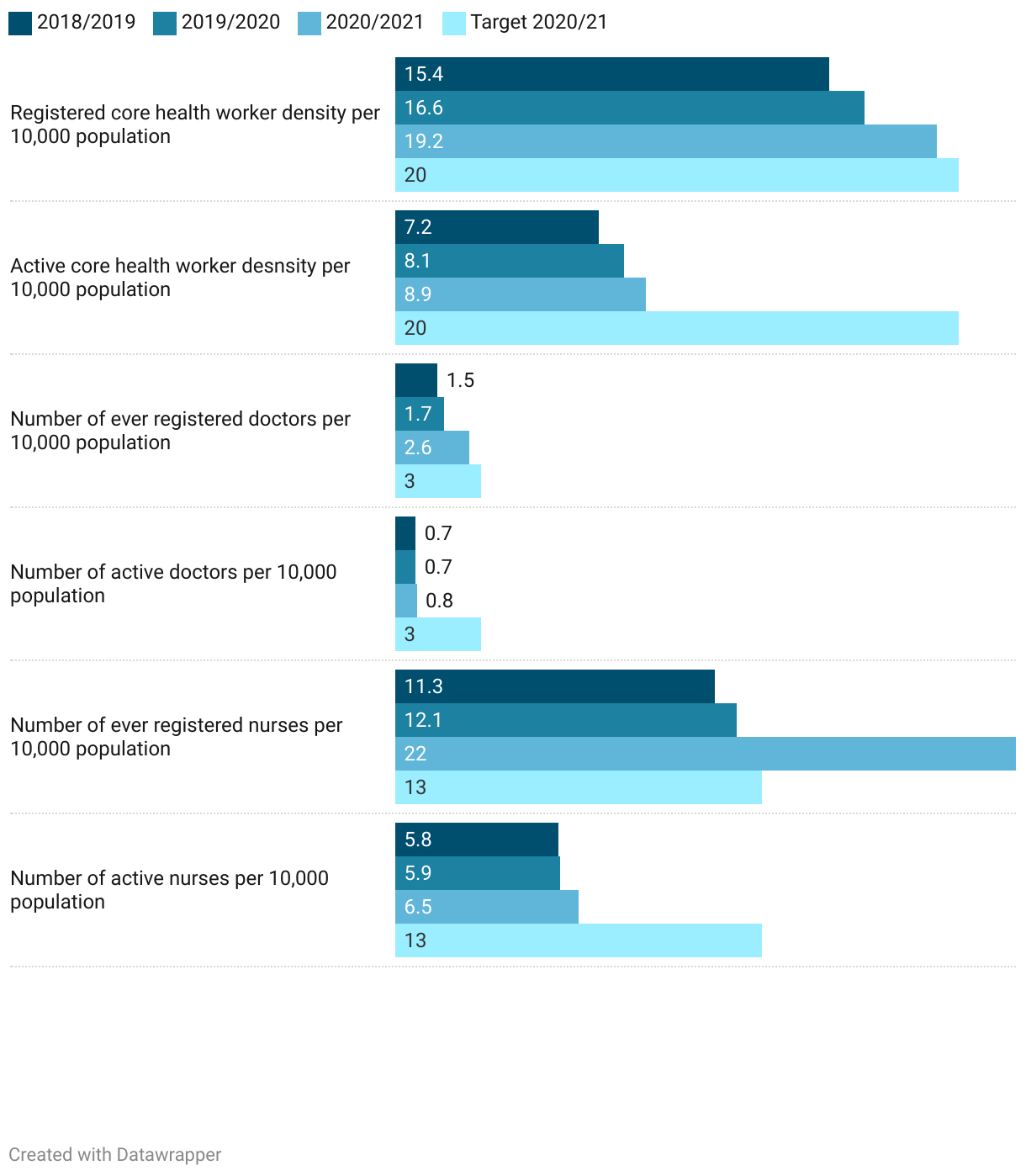 The number of active doctors and nurses per 10,000 people is less than that of registered doctors and nurses on factors such as outmigration and unemployment