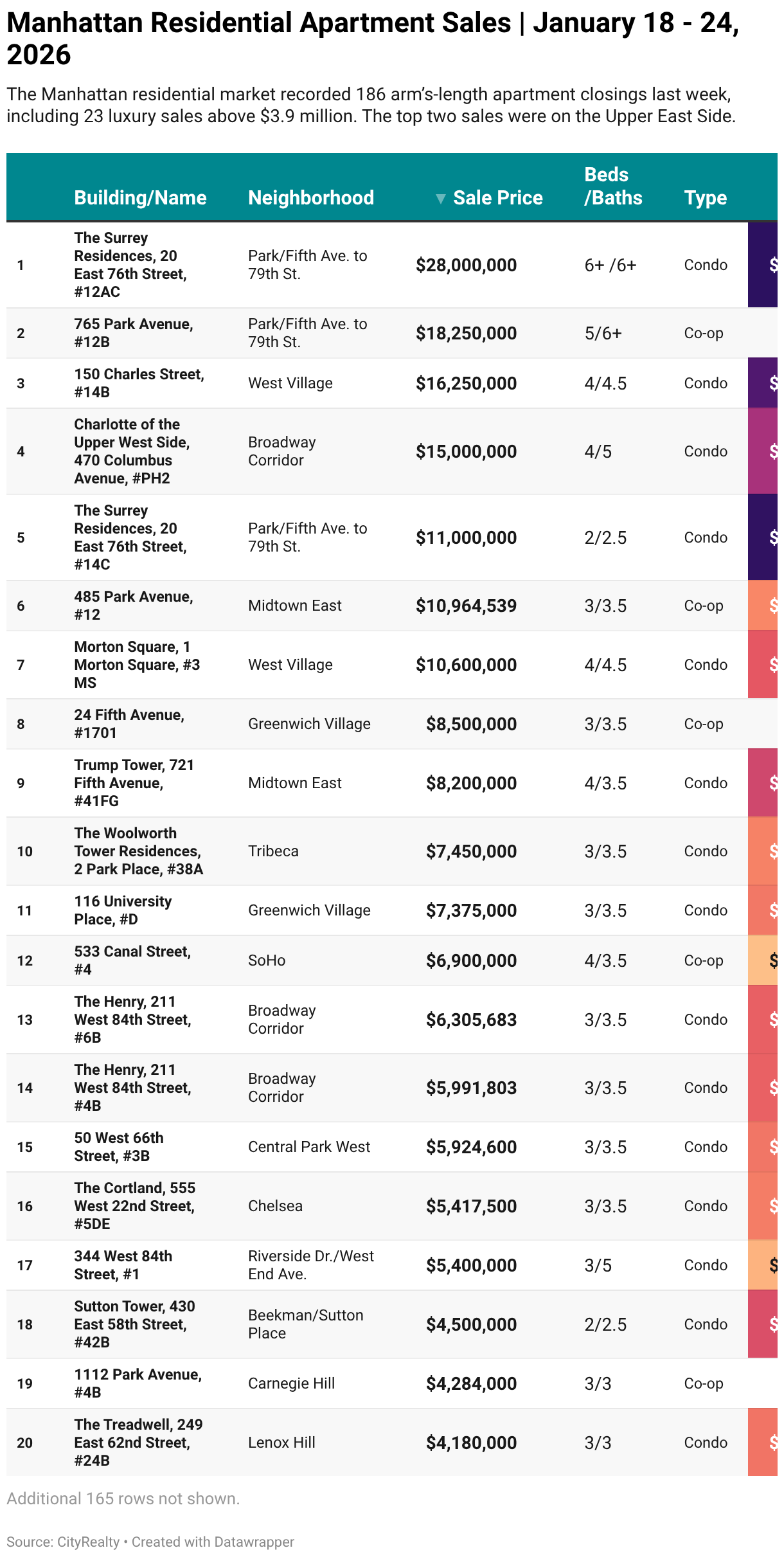 The Manhattan residential market recorded 186 arm’s-length apartment closings last week, including 23 luxury sales above $3.9 million. The top two sales were on the Upper East Side.