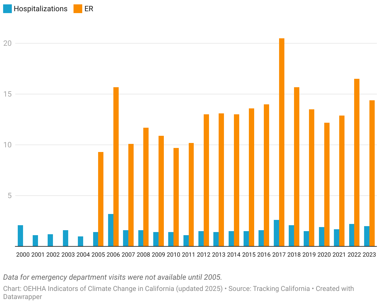 This graph shows reported hospitalizations and emergency department visits from May to September.