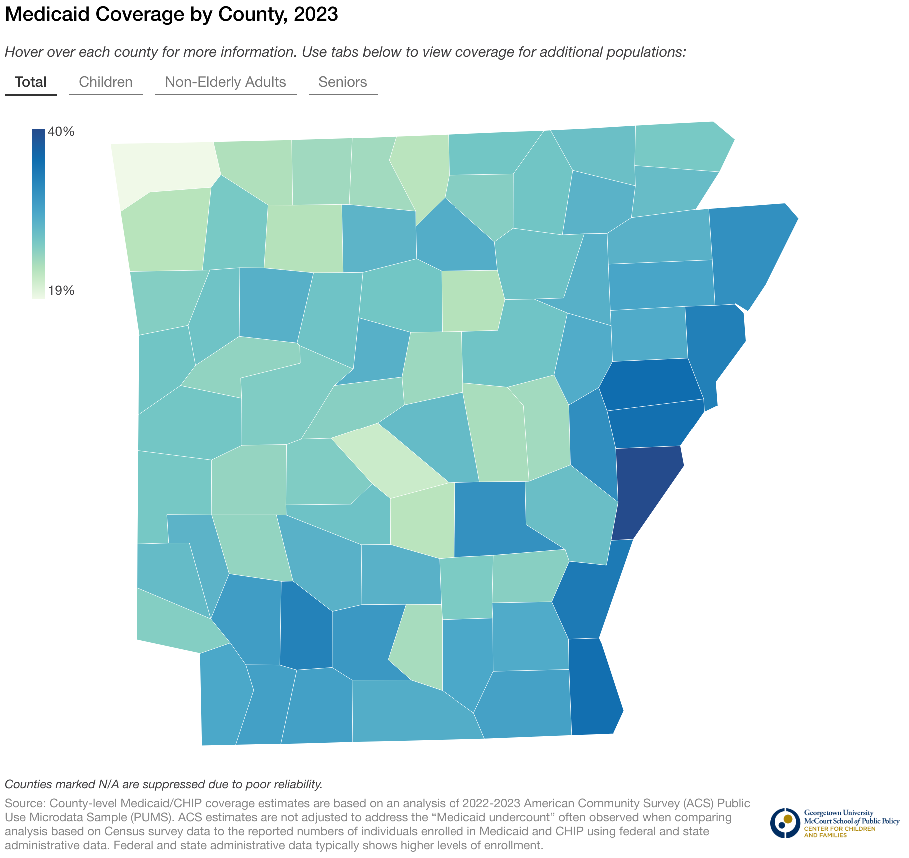 Hover over each county for more information. Use tabs below to view coverage for additional populations: Total Children Non-Elderly Adults Seniors
