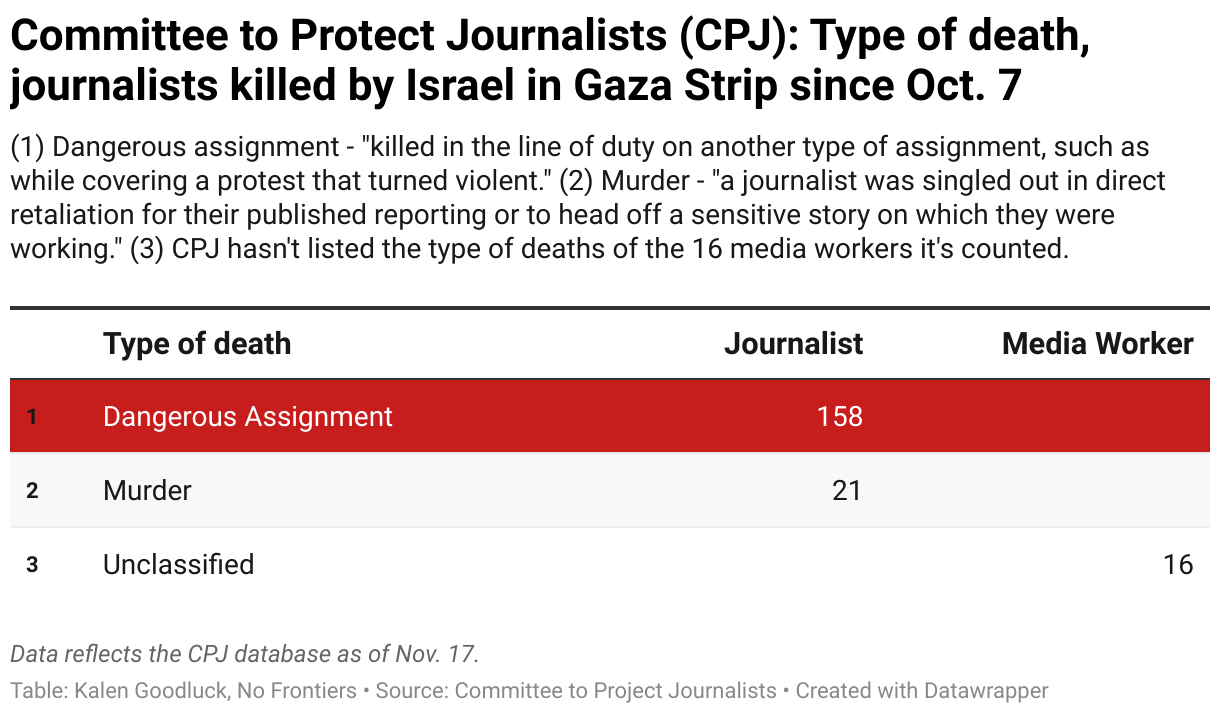 (1) Dangerous assignment - "killed in the line of duty on another type of assignment, such as while covering a protest that turned violent." (2) Murder - "a journalist was singled out in direct retaliation for their published reporting or to head off a sensitive story on which they were working." (3) CPJ hasn't listed the type of deaths of the 16 media workers it's counted.