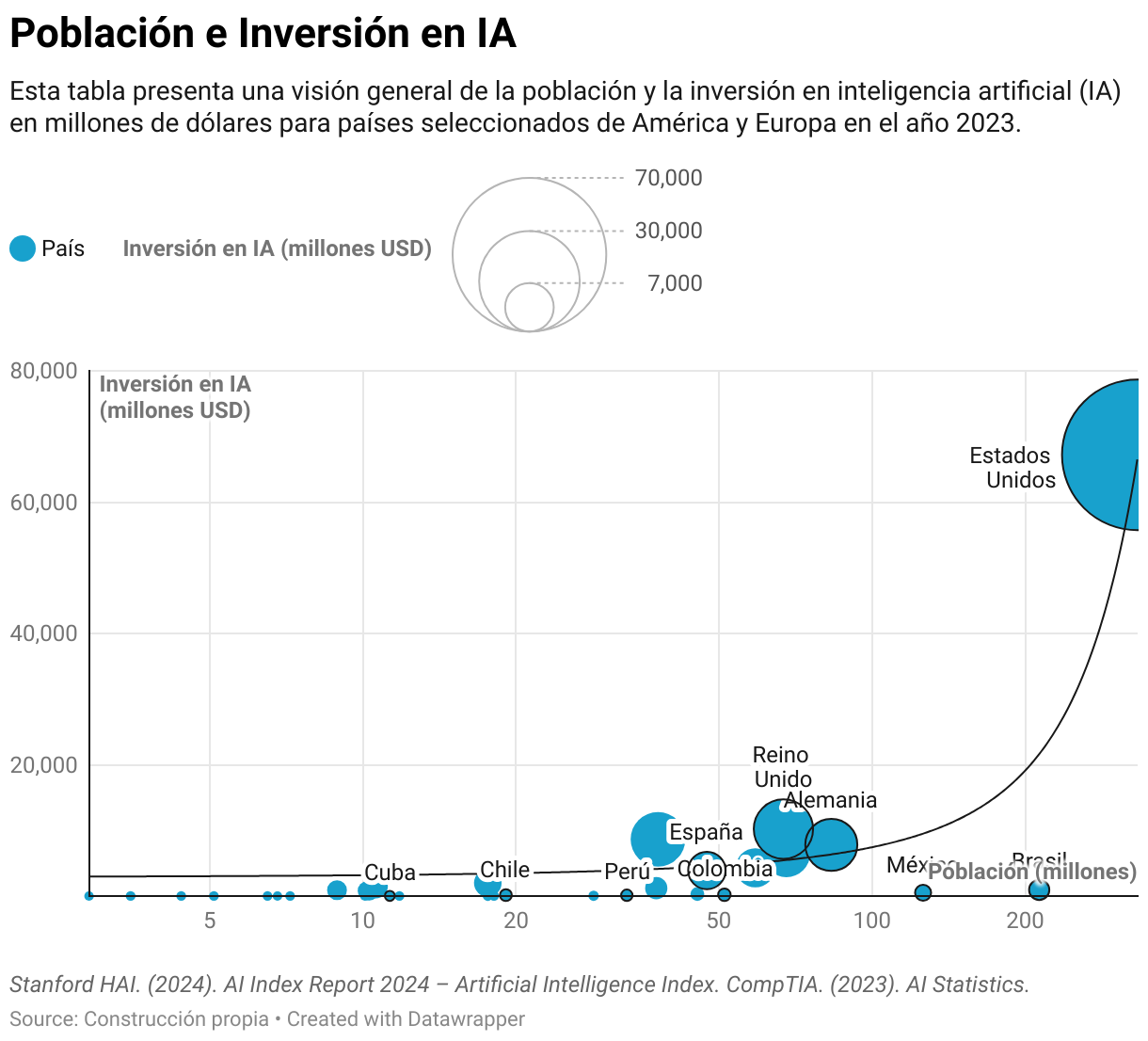 Esta tabla presenta una visión general de la población y la inversión en inteligencia artificial (IA) en millones de dólares para países seleccionados de América y Europa en el año 2023.