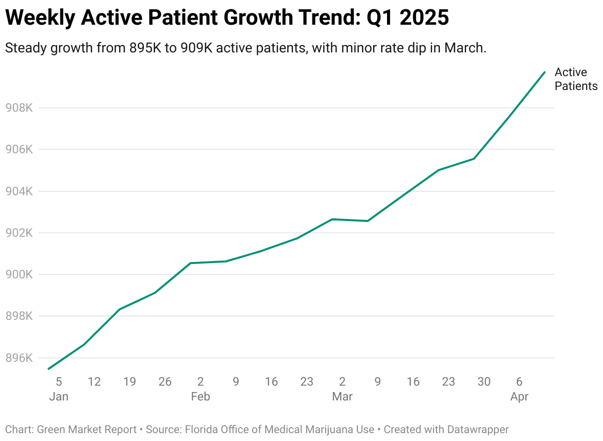 Steady growth from 895K to 909K active patients, with minor rate dip in March.