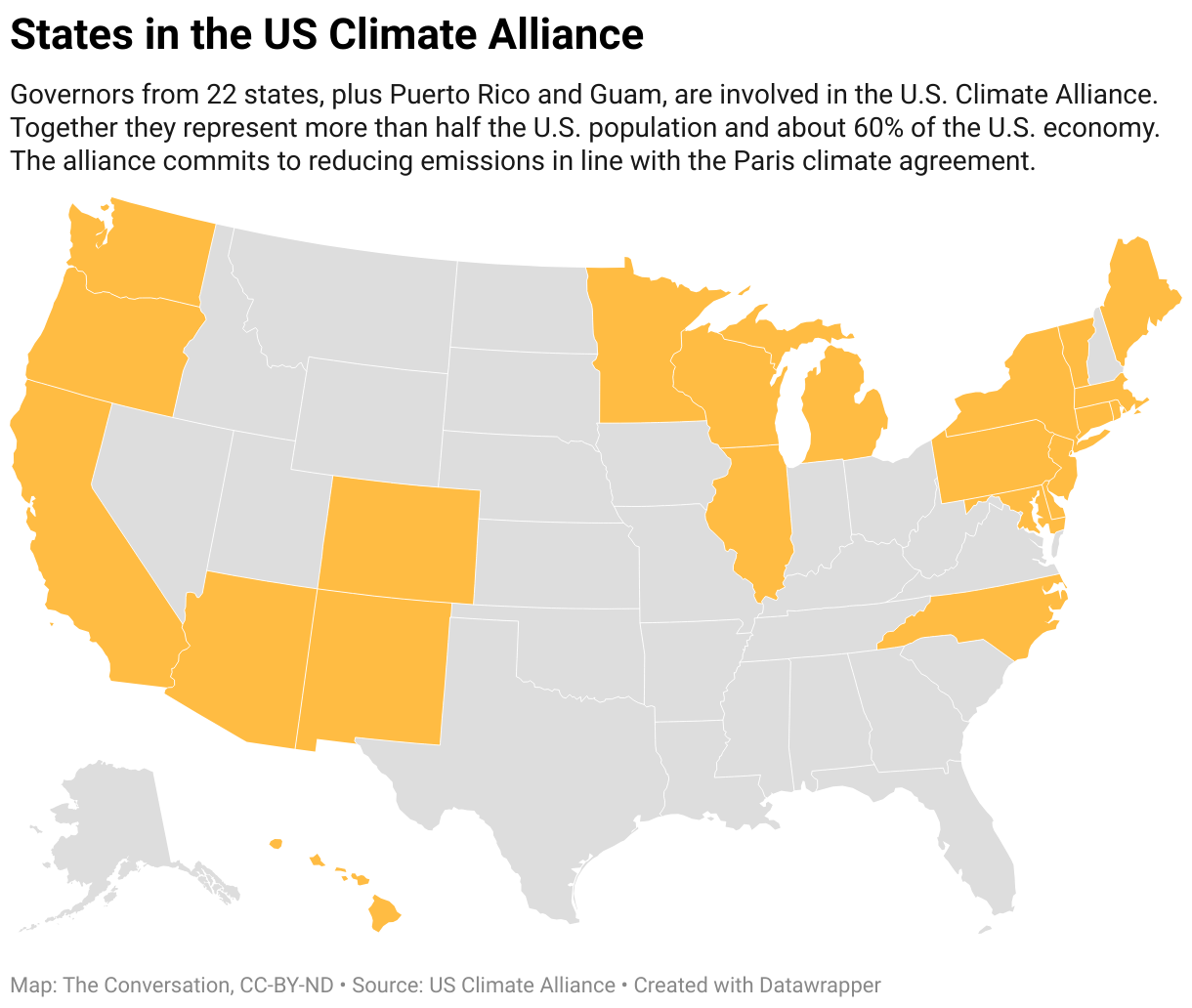 Governors from 22 states, plus Puerto Rico and Guam, are involved in the U.S. Climate Alliance. Together they represent more than half the U.S. population and about 60% of the U.S. economy. The alliance commits to reducing emissions in line with the Paris climate agreement.