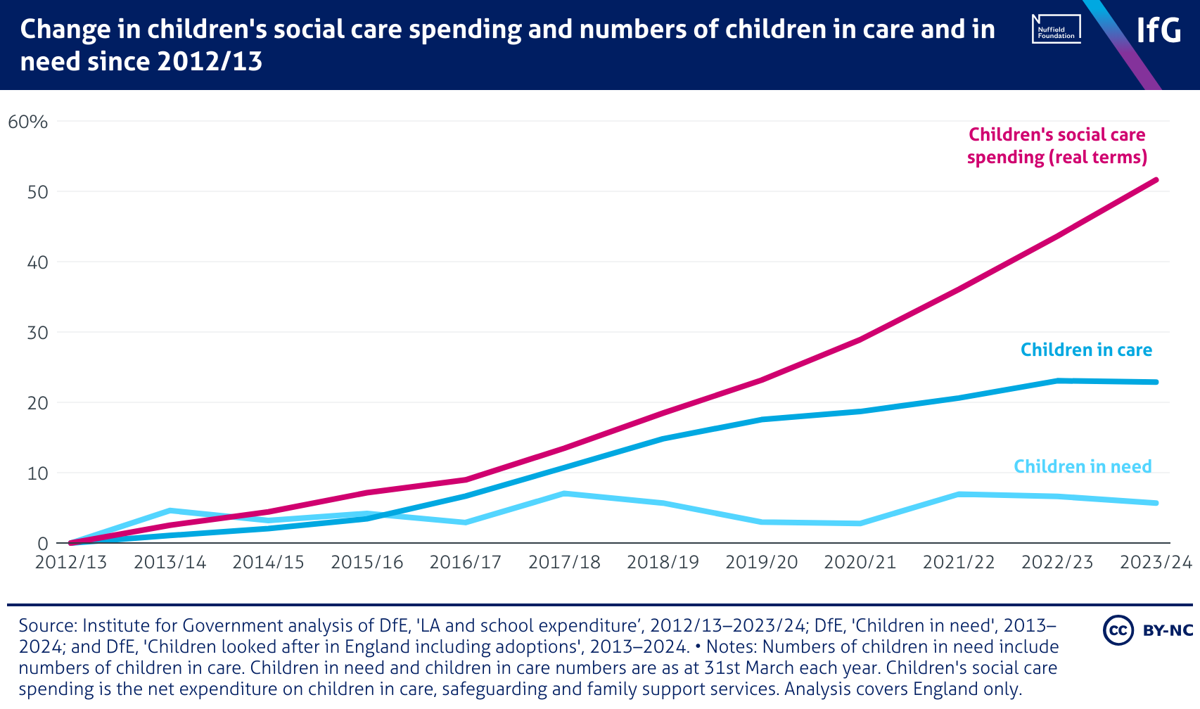 A line chart from the Institute for Government showing change in children's social care spending and numbers of children in care and in need since 2012/13, where spending has risen by more than 50%, yet the number of children in care has only risen by 23%, and the number of children in need by 6%