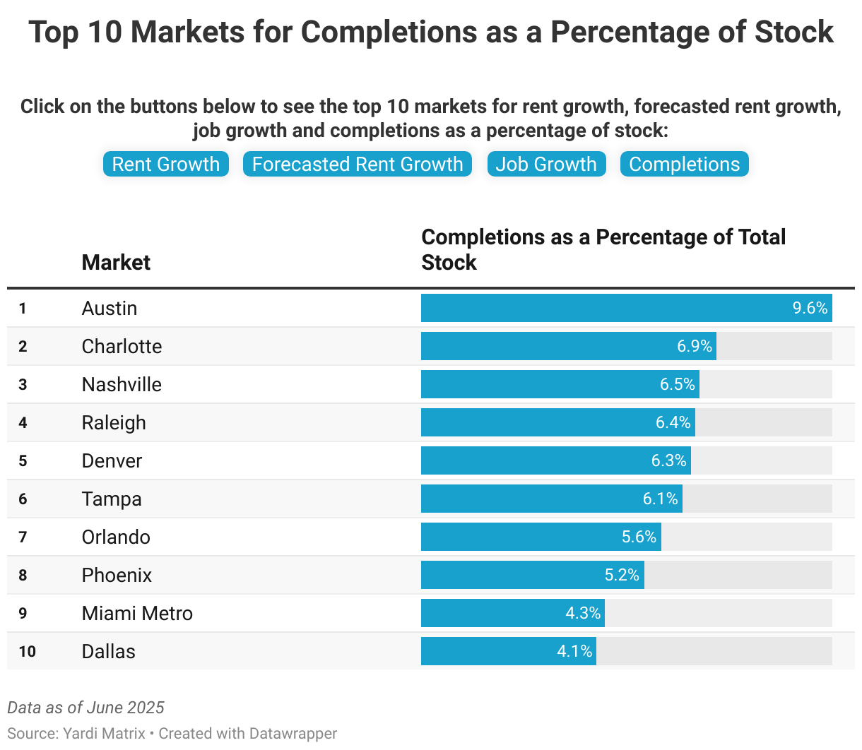 Click on the buttons below to see the top 10 markets for rent growth, forecasted rent growth, job growth and completions as a percentage of stock: