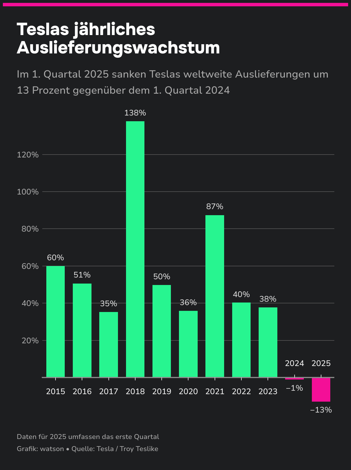 Im 1. Quartal 2025 sanken Teslas weltweite Auslieferungen um 13 Prozent gegenüber dem 1. Quartal 2024