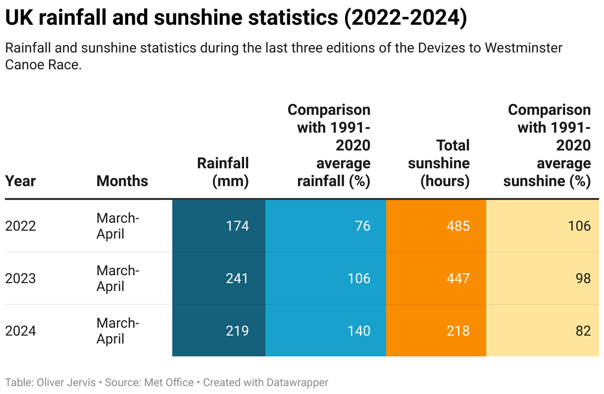 Rainfall and sunshine statistics during the last three editions of the Devizes to Westminster Canoe Race.