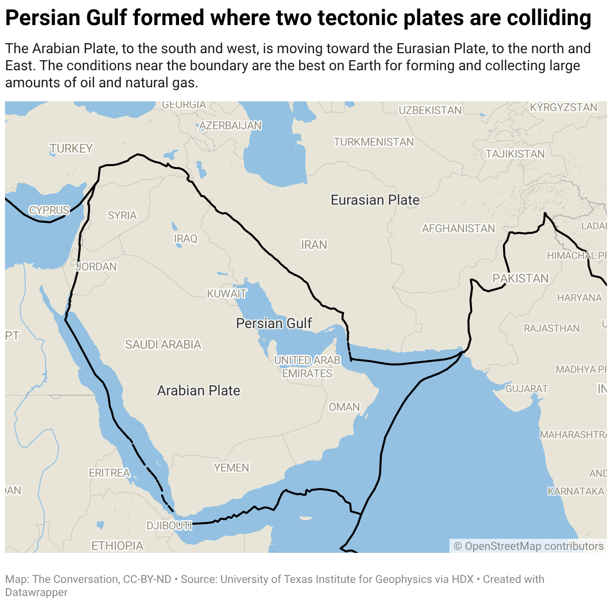 The Arabian Plate, to the south and west, is moving toward the Eurasian Plate, to the north and East. The conditions near the boundary are the best on Earth for forming and collecting large amounts of oil and natural gas.