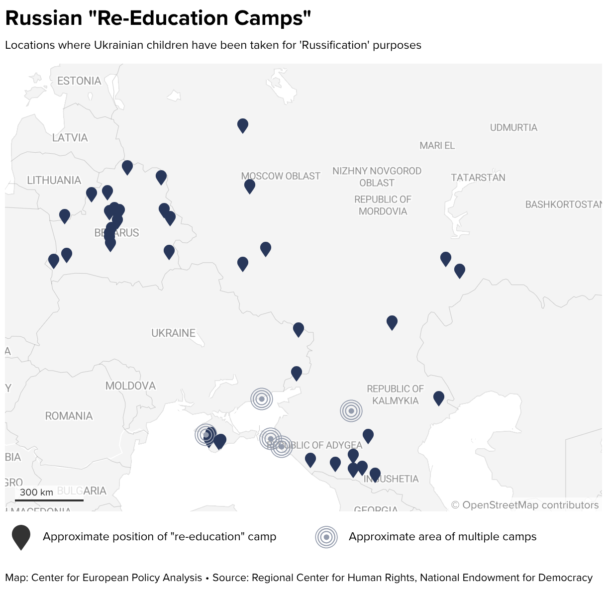 Locations where Ukrainian children have been taken for 'Russification' purposes