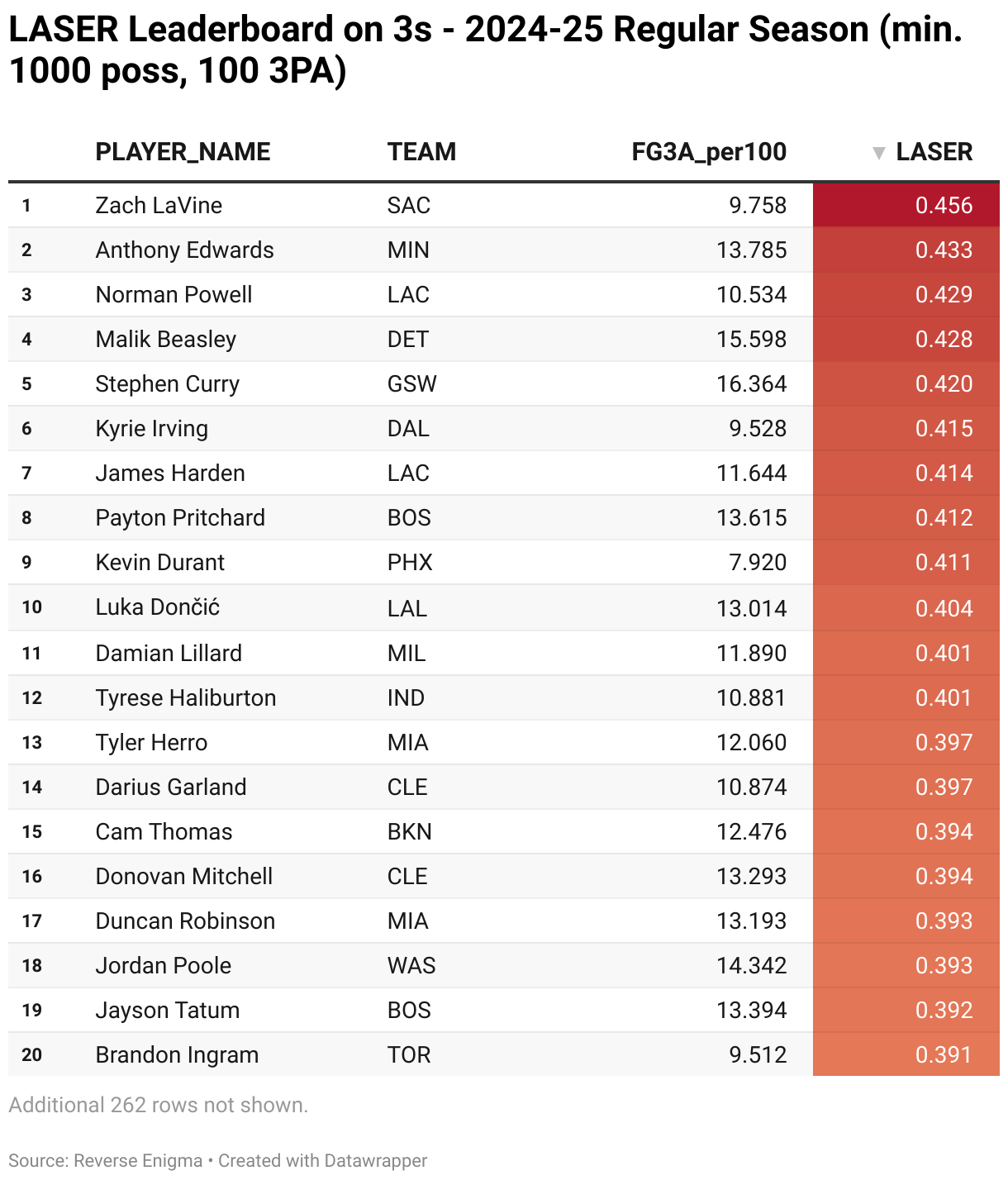 LASER Leaderboard on 3s - 2024-25 Regular Season (min. 1000 poss, 100 3PA)