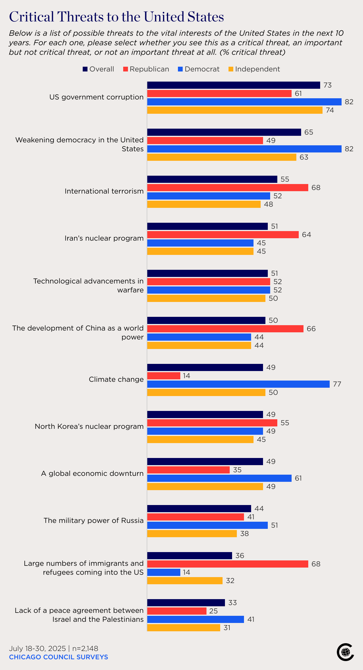 Below is a list of possible threats to the vital interests of the United States in the next 10 years. For each one, please select whether you see this as a critical threat, an important but not critical threat, or not an important threat at all. (% critical threat)