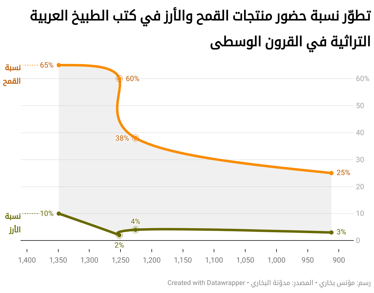 تطوّر نسبة حضور منتجات القمح والأرز في كتب الطبيخ العربية التراثية في القرون الوسطى