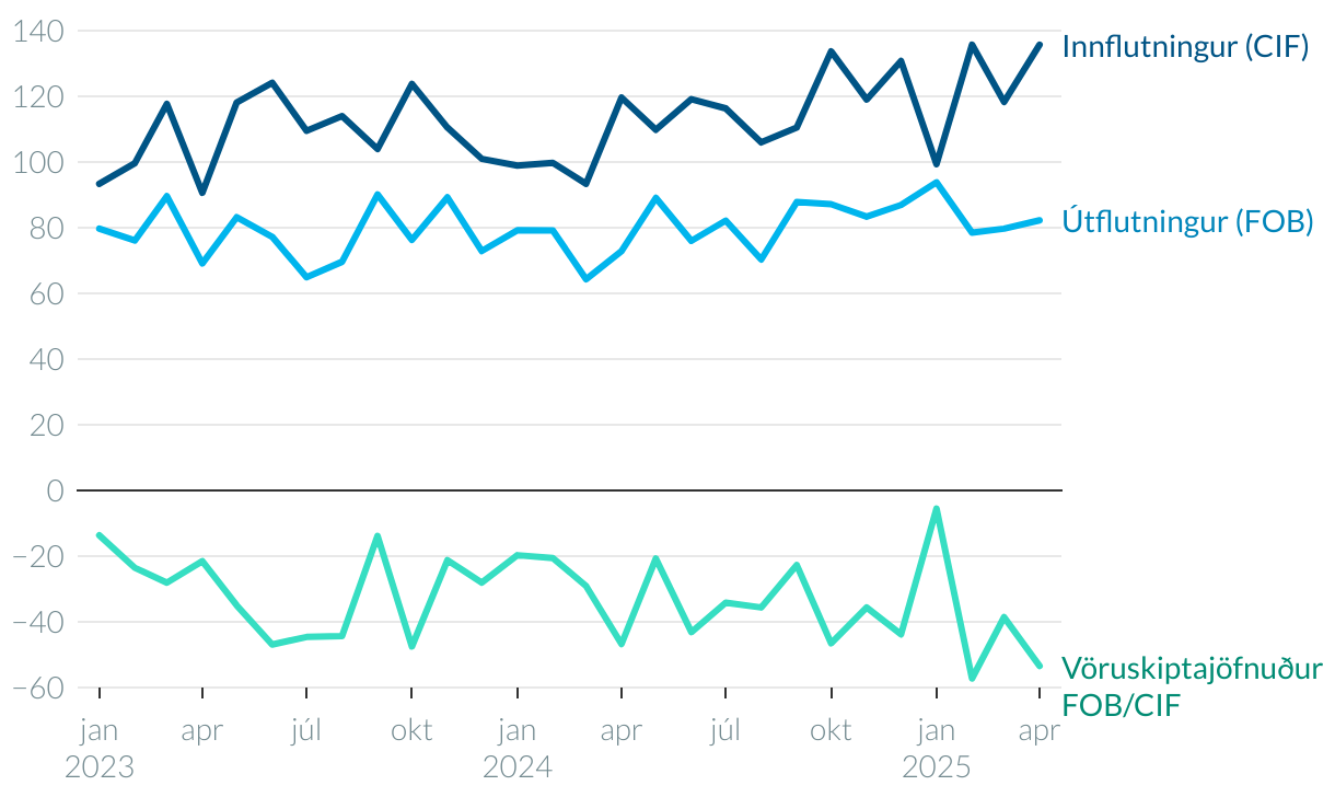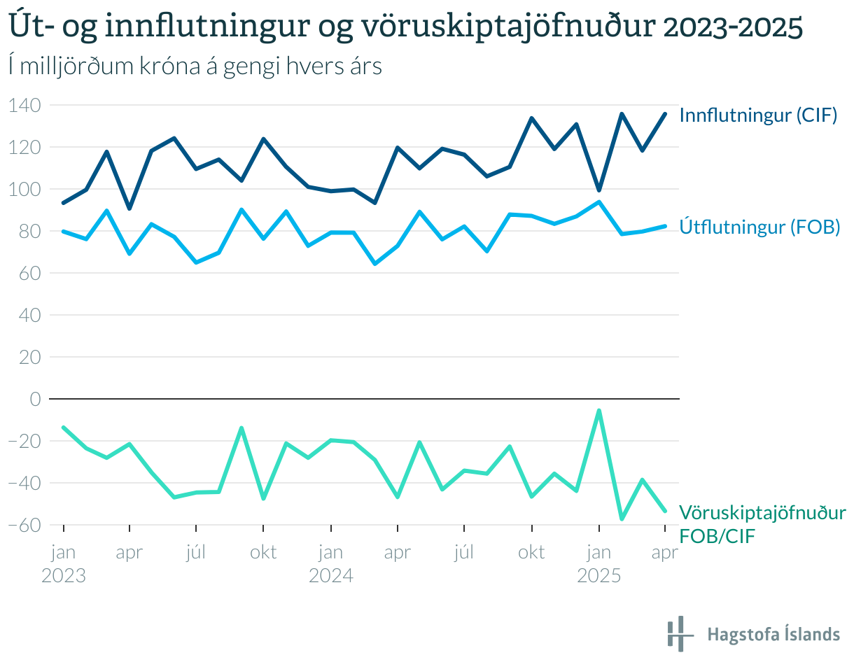 Út- og innflutningur og vöruskiptajöfnuður 2023-2025