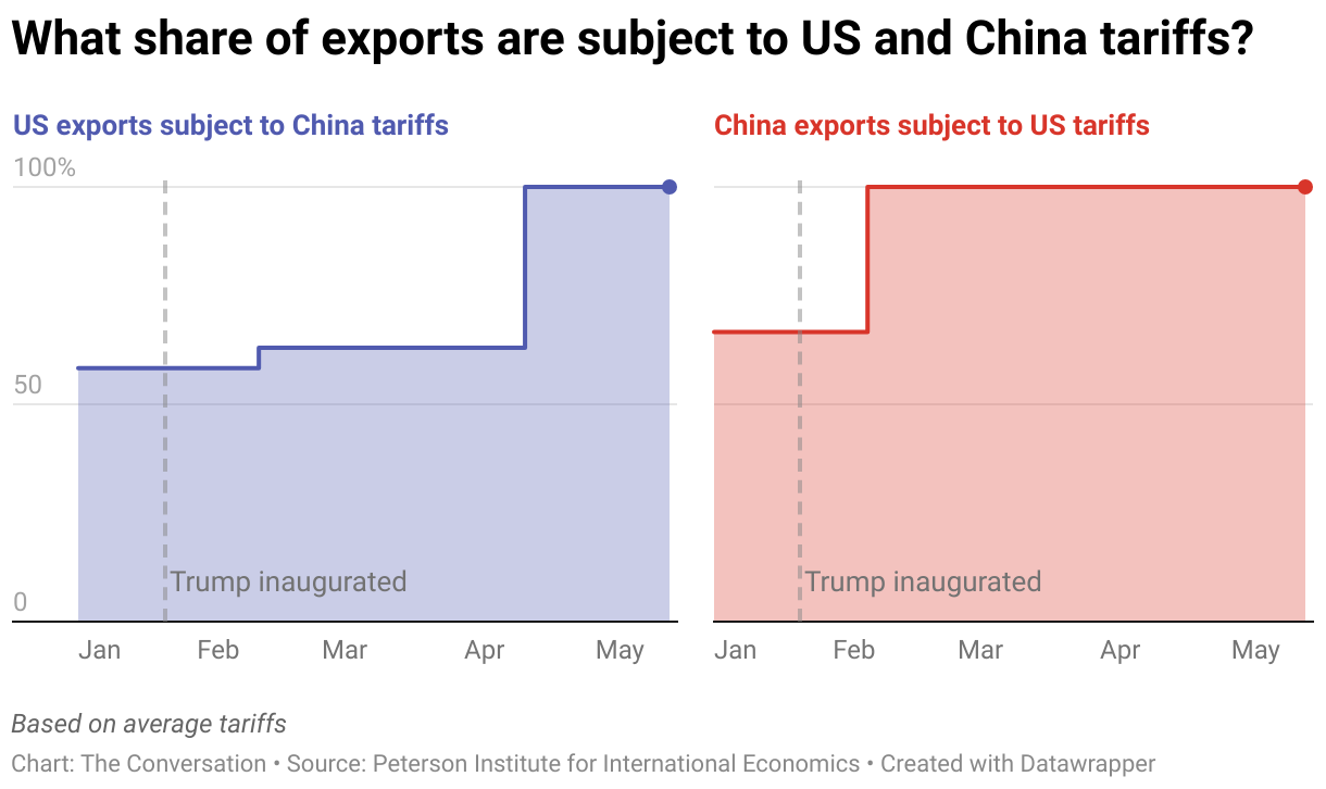What share of exports are subject to US and China tariffs?