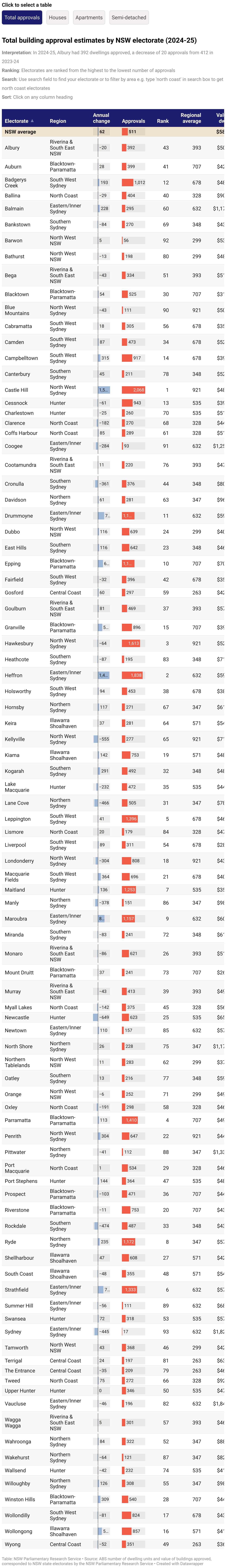 Interpretation: In 2024-25, Albury had 392 dwellings approved, a decrease of 20 approvals from 412 in 2023-24