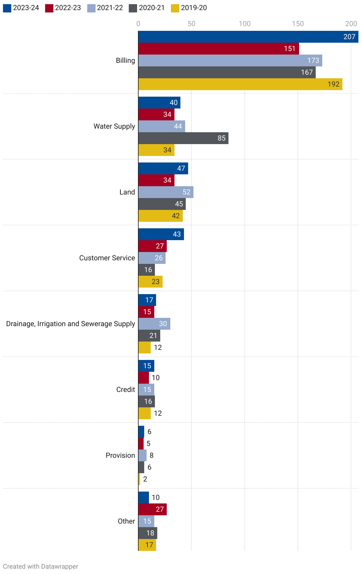 This chart shows the number of complaints in each of the last five years in the categories of billing, water supply, land, customer service, drainage, irrigation and sewerage supply, credit, provision and other. Click the Get the Data link to download the data.