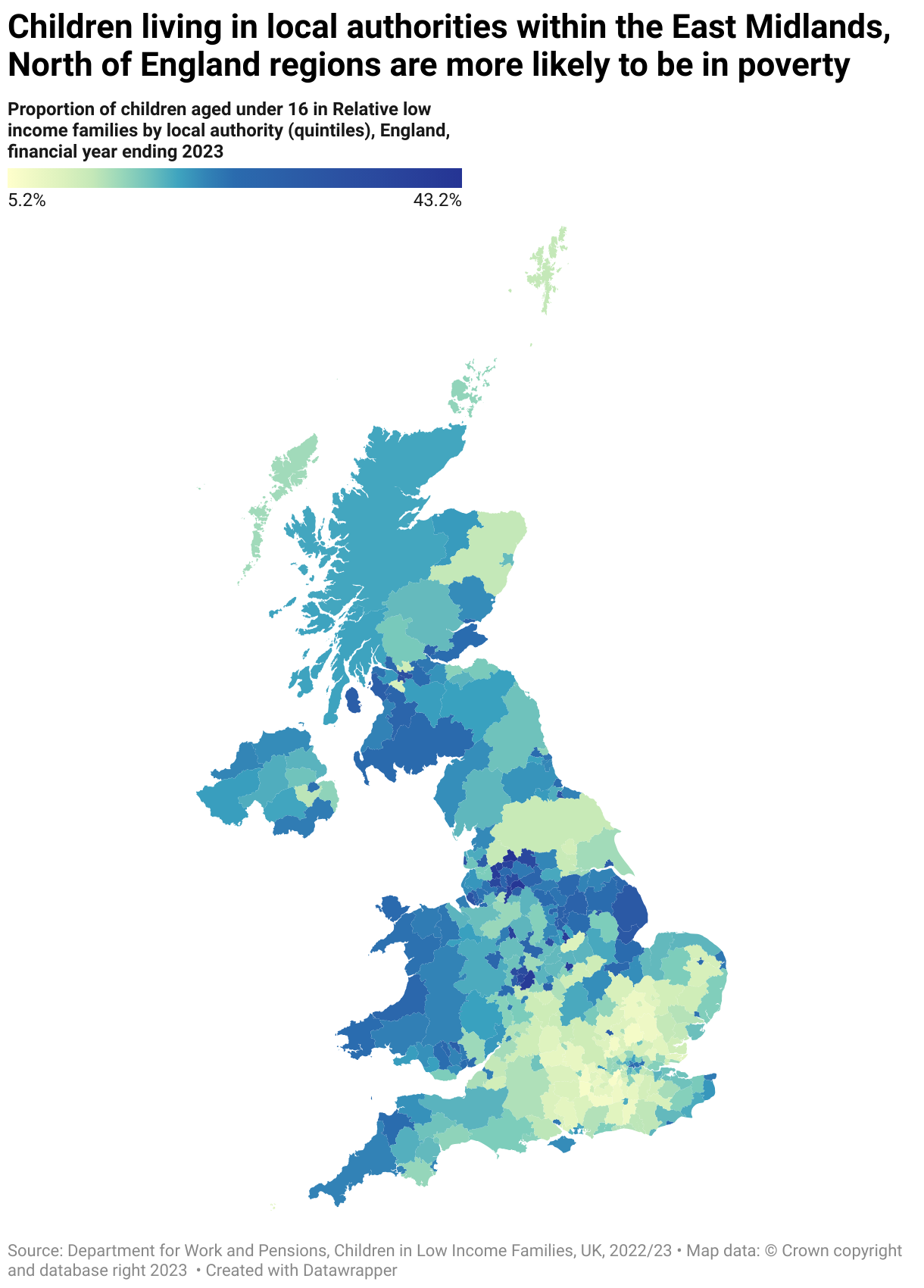 Children living in local authorities within the East Midlands, North of England regions are more likely to be in poverty