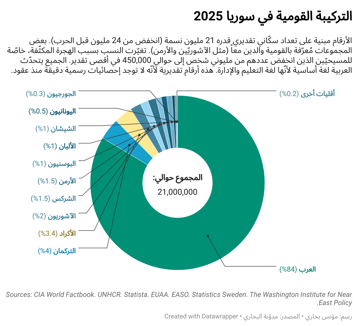 الأرقام مبنية على تعداد سكّاني تقديري قدره 21 مليون نسمة (انخفض من 24 مليون قبل الحرب). بعض المجموعات مُعرّفة بالقومية والدين معاً (مثل الآشوريّين والأرمن). تغيّرت النسب بسبب الهجرة المكثّفة، خاصّة للمسيحيّين الذين انخفض عددهم من مليوني شخص إلى حوالي 450,000 في أقصى تقدير. الجميع يتحدّث العربية لغة أساسية لأنّها لغة التعليم والإدارة. هذه أرقام تقديرية لأنّه لا توجد إحصائيات رسمية دقيقة منذ عقود.