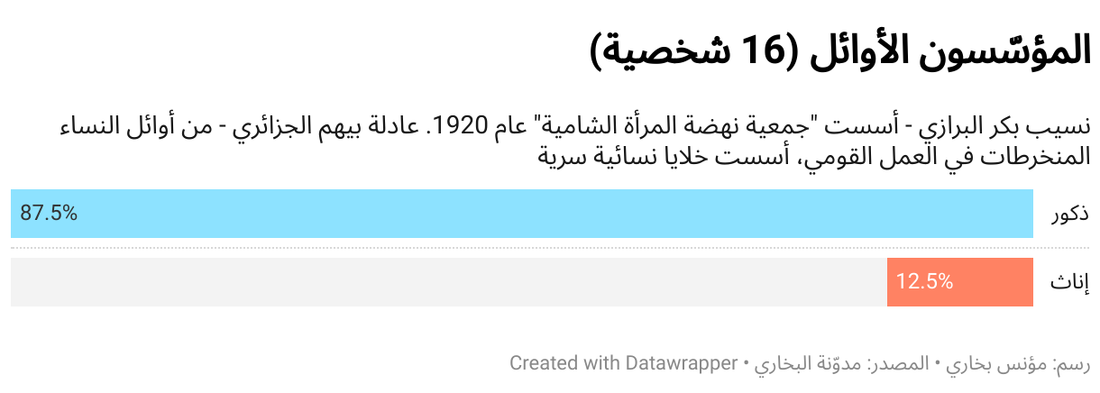 نسيب بكر البرازي - أسست "جمعية نهضة المرأة الشامية" عام 1920. عادلة بيهم الجزائري - من أوائل النساء المنخرطات في العمل القومي، أسست خلايا نسائية سرية