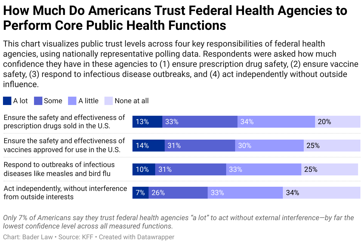 This chart visualizes public trust levels across four key responsibilities of federal health agencies, using nationally representative polling data. Respondents were asked how much confidence they have in these agencies to (1) ensure prescription drug safety, (2) ensure vaccine safety, (3) respond to infectious disease outbreaks, and (4) act independently without outside influence.