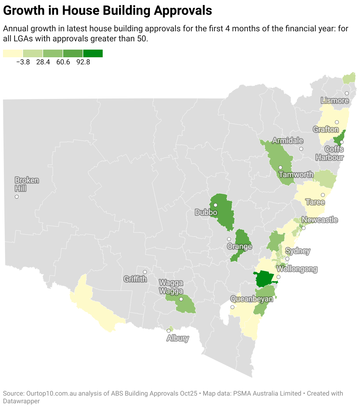 Annual growth in latest house building approvals for the first 4 months of the financial year: for all LGAs with approvals greater than 50.