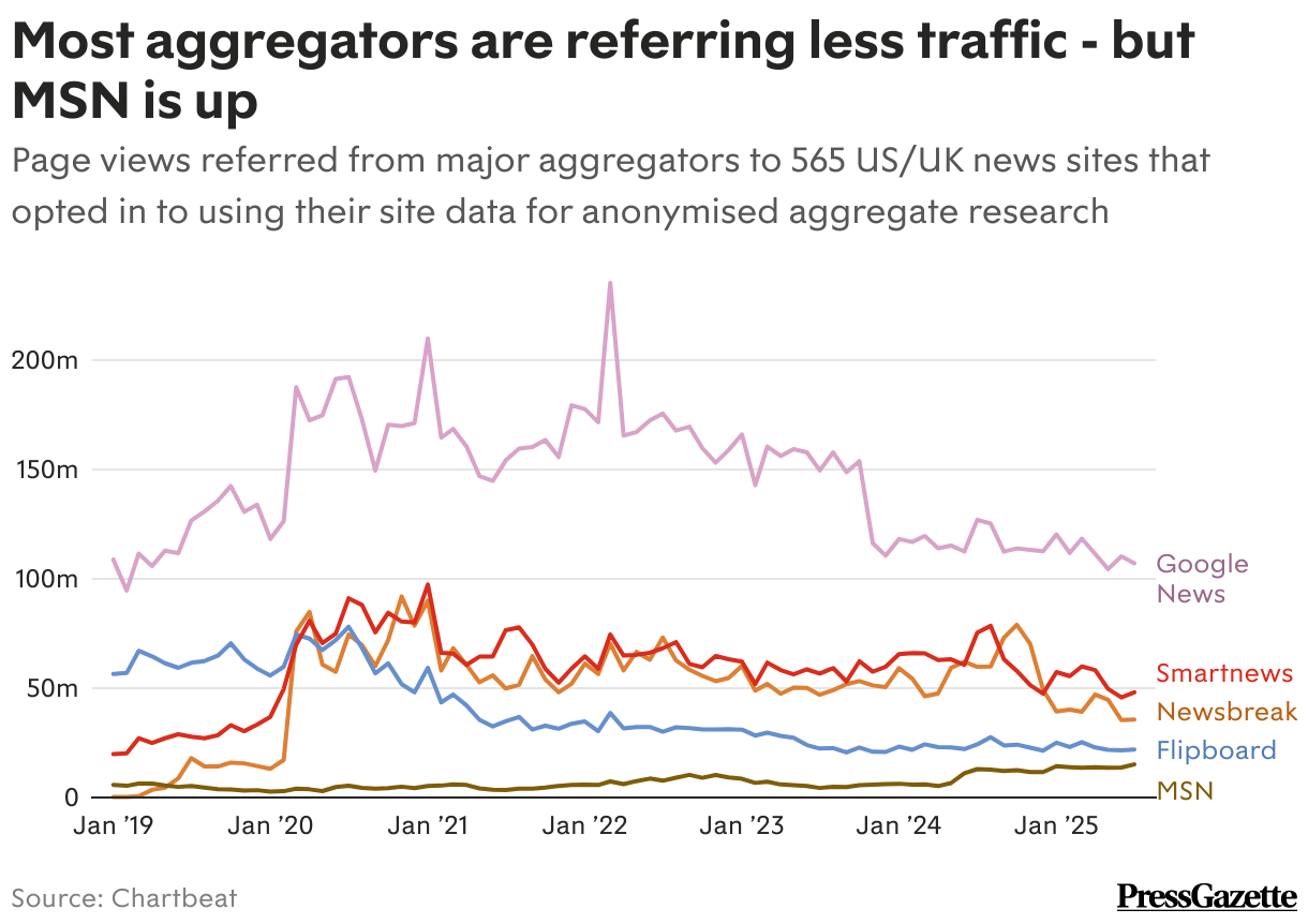 Page views referred from major aggregators to 565 US/UK news sites that opted in to using their site data for anonymised aggregate research