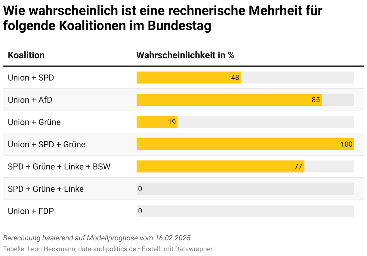 Wie wahrscheinlich ist eine rechnerische Mehrheit für folgende Koalitionen im Bundestag