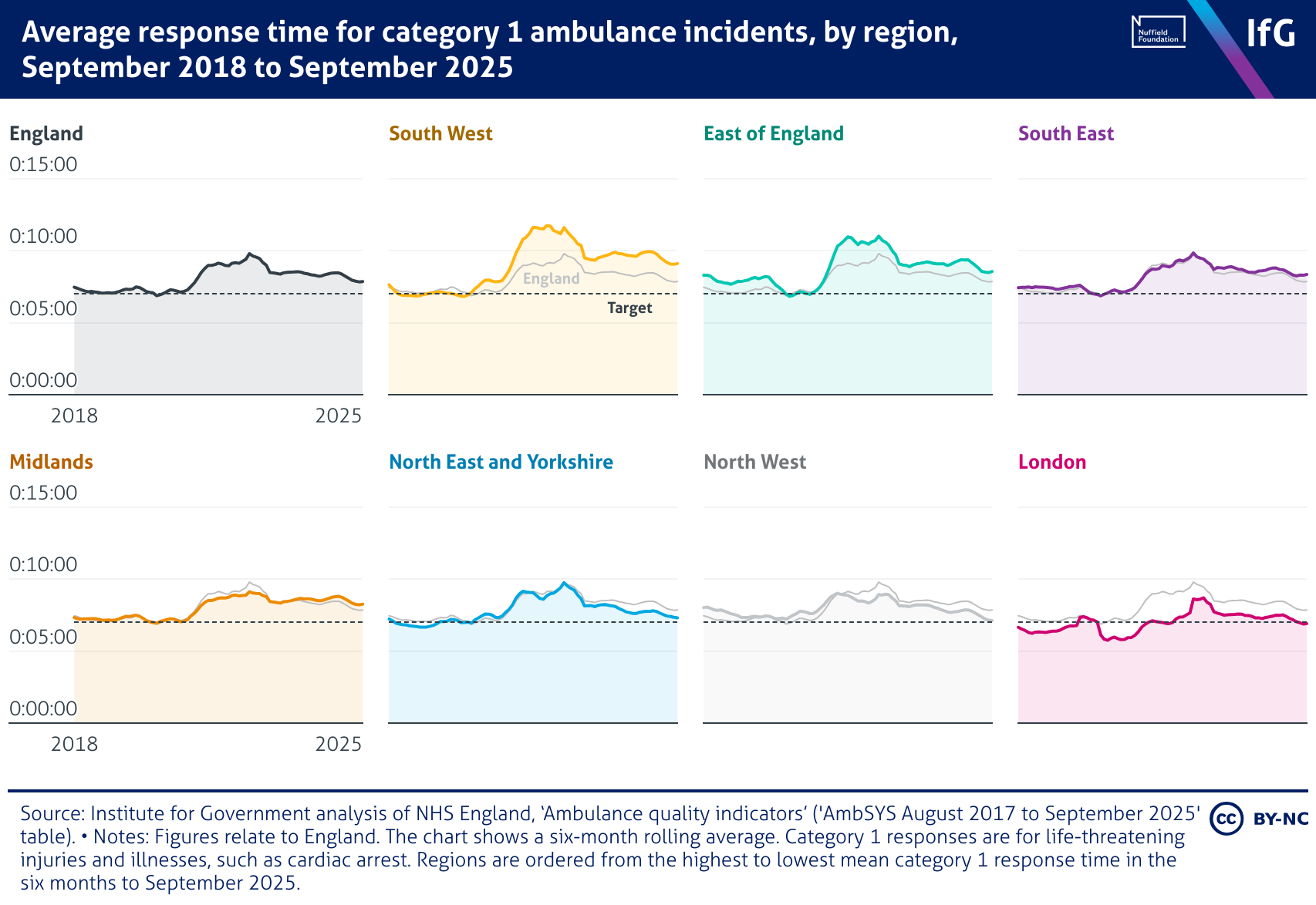 A small multiples charts from the Institute for Government showing Average response time for category 1 ambulance incidents, by region, September 2018 to September 2025. Response times for category 1 incidents increased across all regions during the pandemic and have stayed above the national target in all regions except London. The South West and East of England recorded the slowest average times, while London and the North West performed closest to the England average.