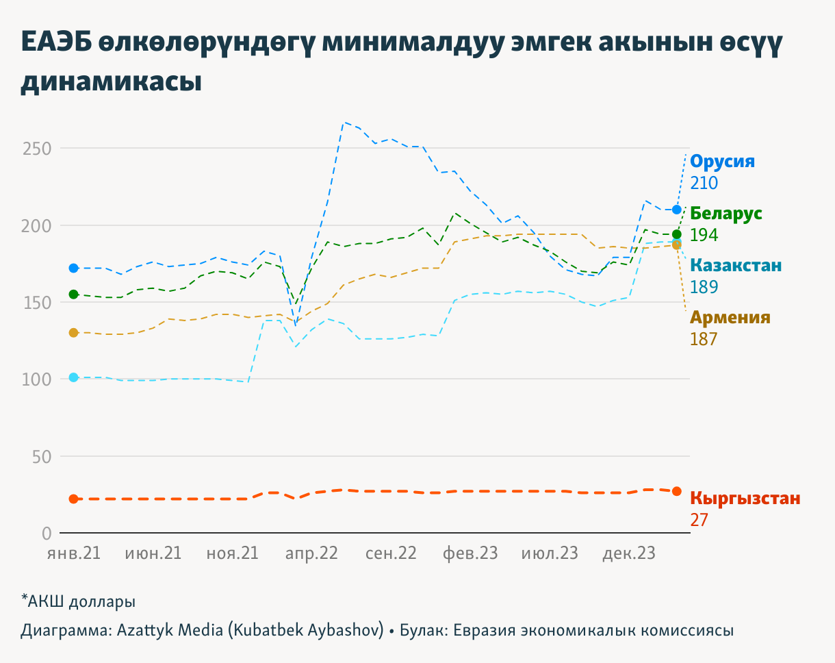 ЕАЭБ өлкөлөрүндөгү минималдуу эмгек акынын өсүү динамикасы