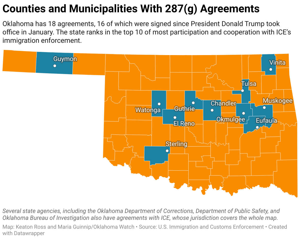 Oklahoma has 18 agreements, 16 of which were signed since President Donald Trump took office in January. The state ranks in the top 10 of most participation and cooperation with ICE’s immigration enforcement.