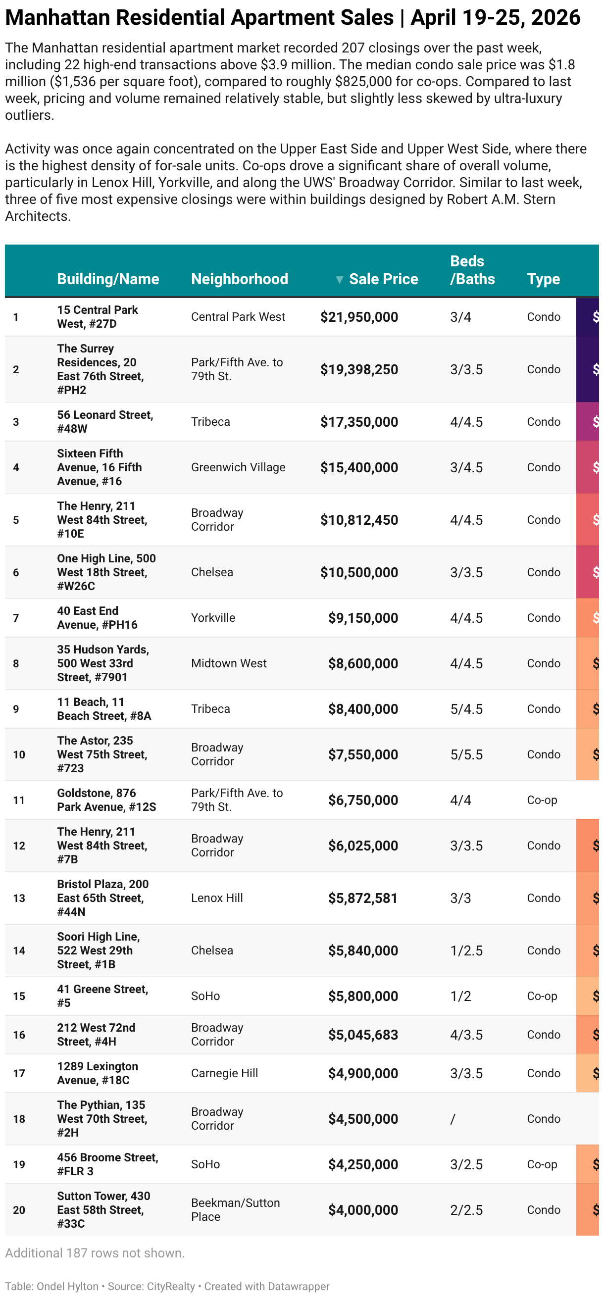 The Manhattan residential apartment market recorded 207 closings over the past week, including 22 high-end transactions above $3.9 million. The median condo sale price was $1.8 million ($1,536 per square foot), compared to roughly $825,000 for co-ops. Compared to last week, pricing and volume remained relatively stable, but slightly less skewed by ultra-luxury outliers.