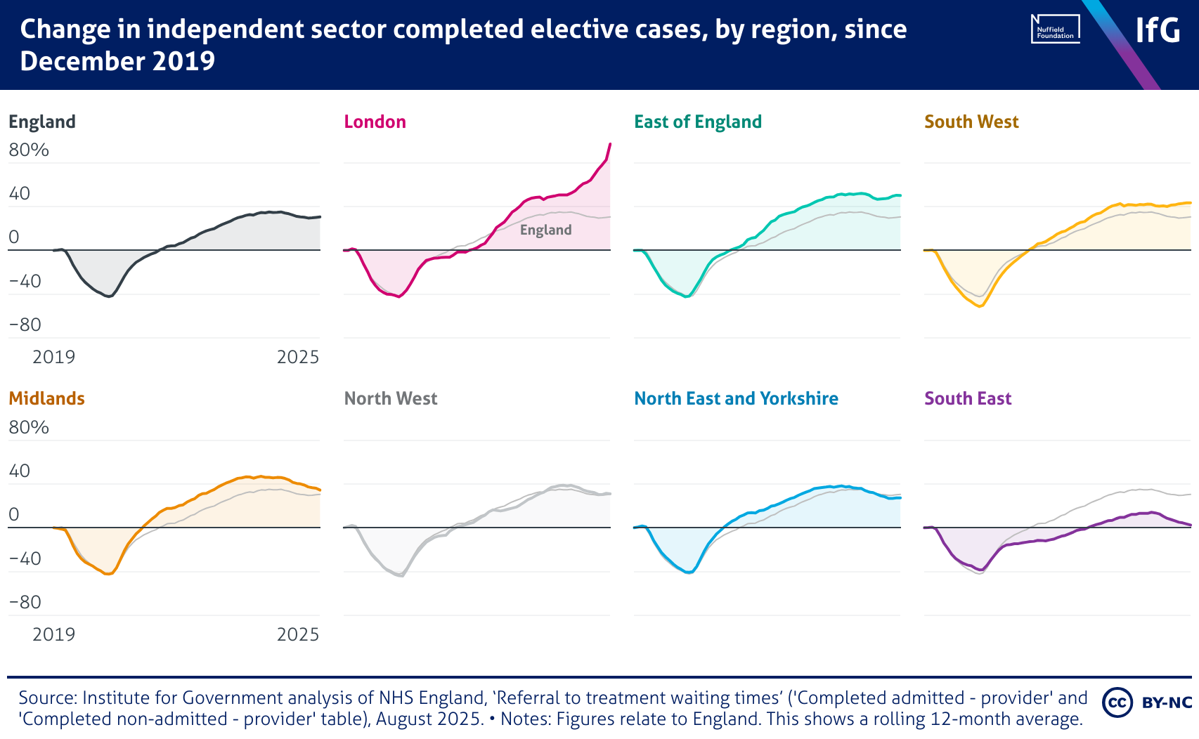 A small multiples chart from the Institute for Government showing Change in independent sector completed elective cases, by region, since December 2019, where elective cases have increased in all regions following the pandemic. London has seen the biggest increase in ISP activity, up 97.4% as of August 2025, much higher than the England average of 30.6% The South East had the lowest increase, reaching 2.5% over the same time period.