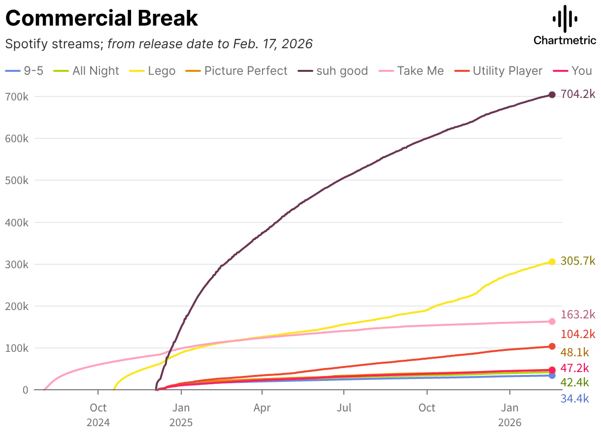 Spotify streams; from release date to Feb. 17, 2026